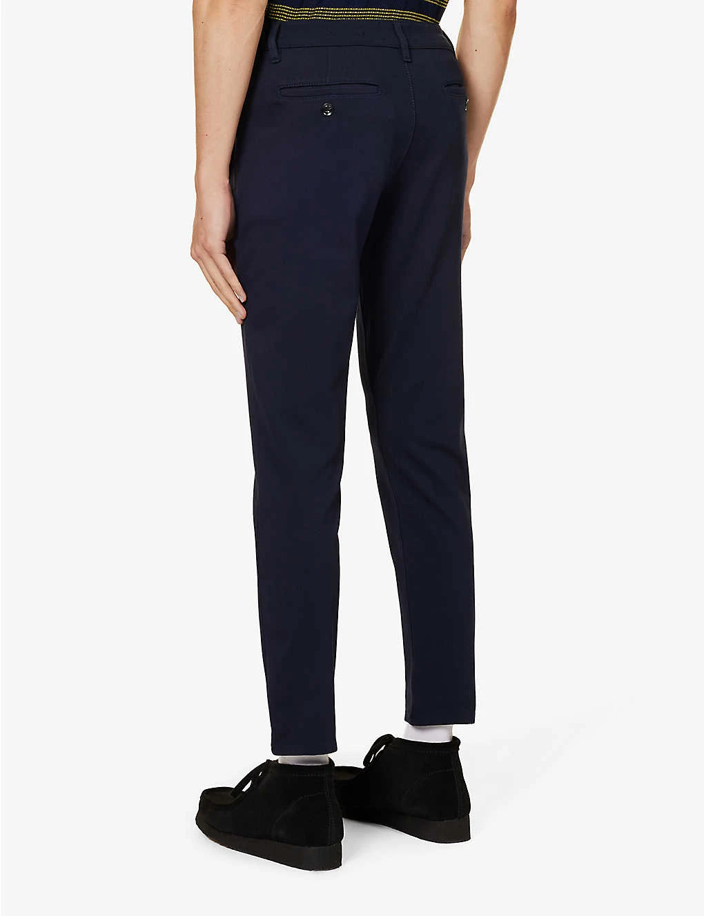 - Regular fit, mid-rise, tapered leg, belt loops, two slip pockets at front, darts at back, two buttoned welt pockets at back, brand patch at back, partially lined