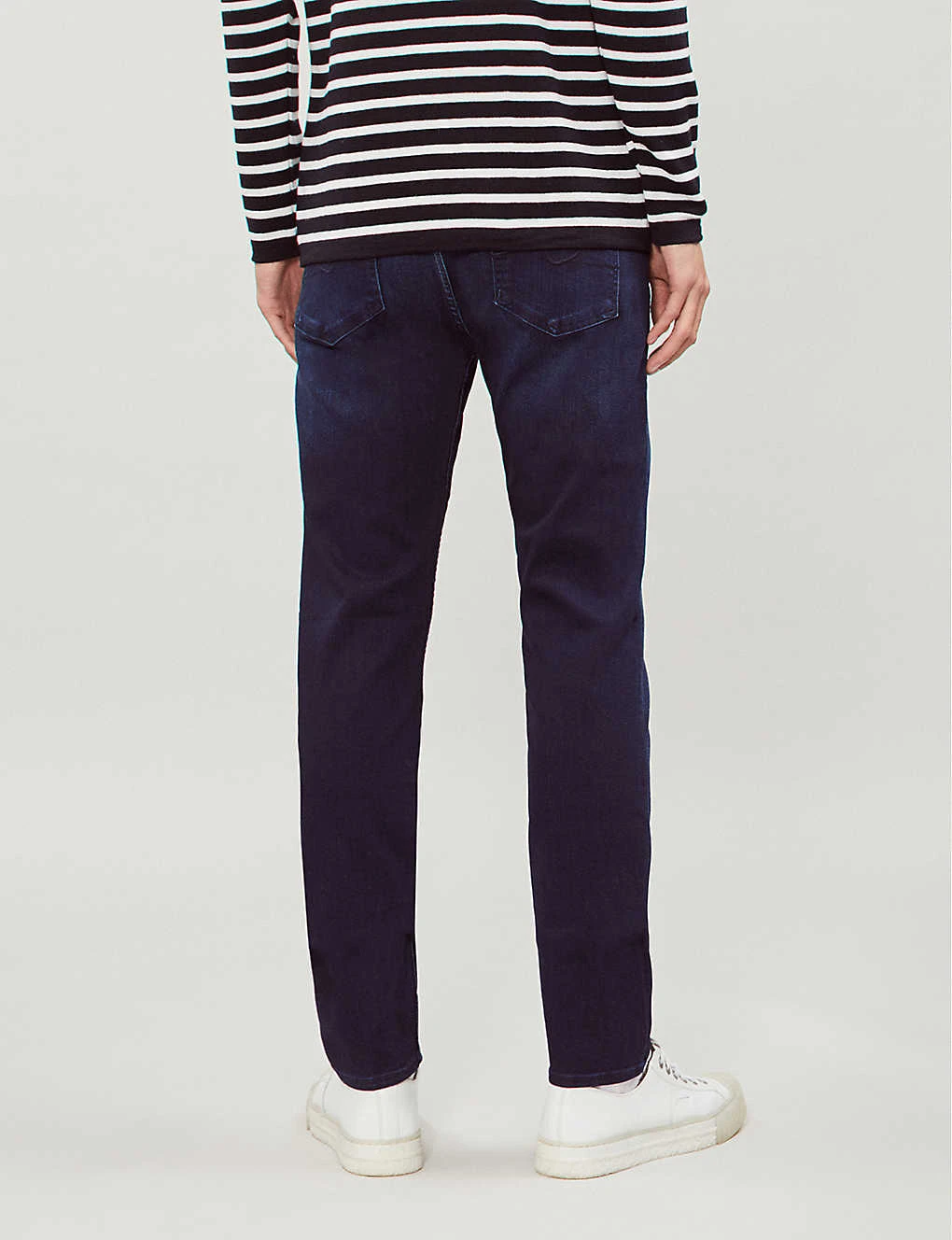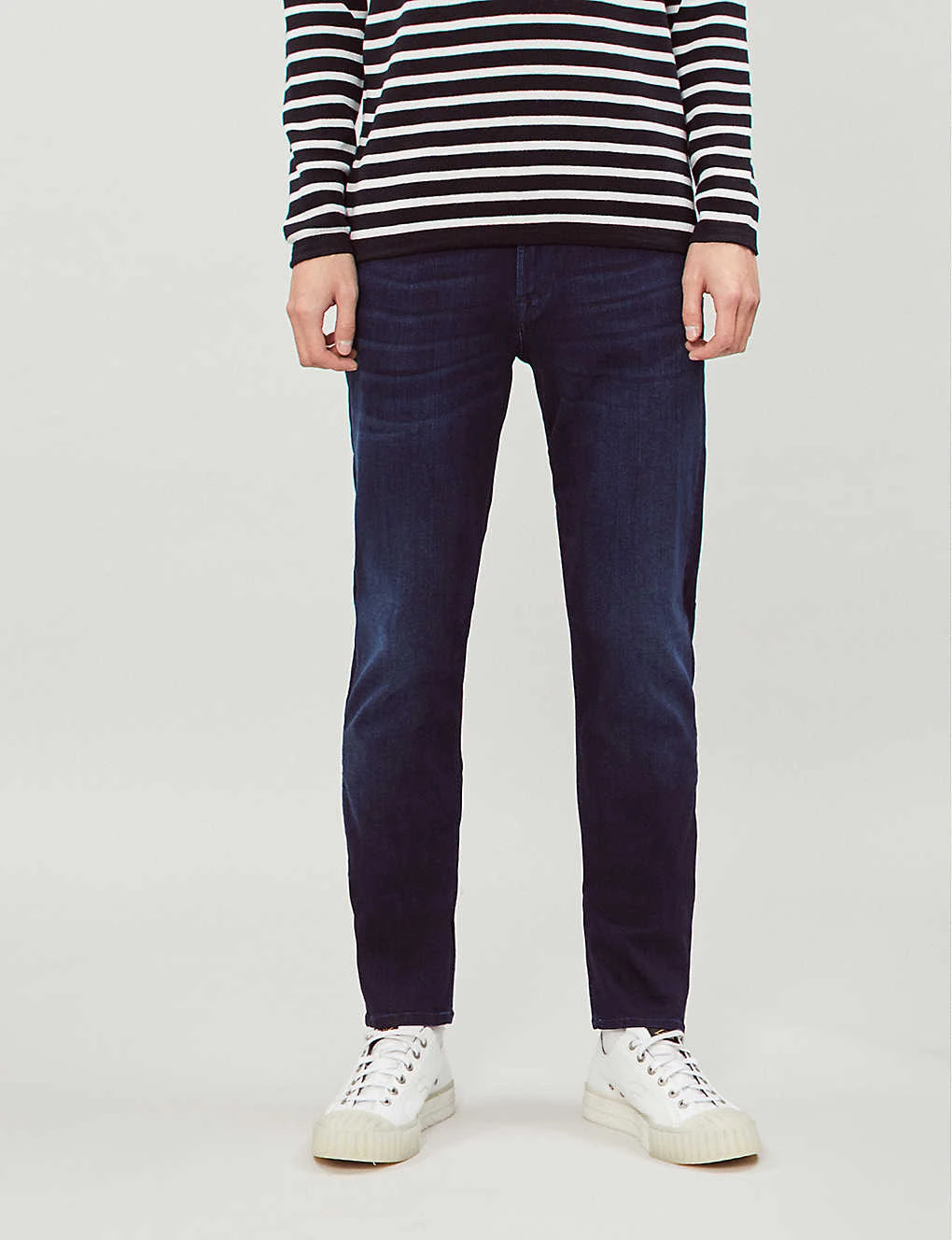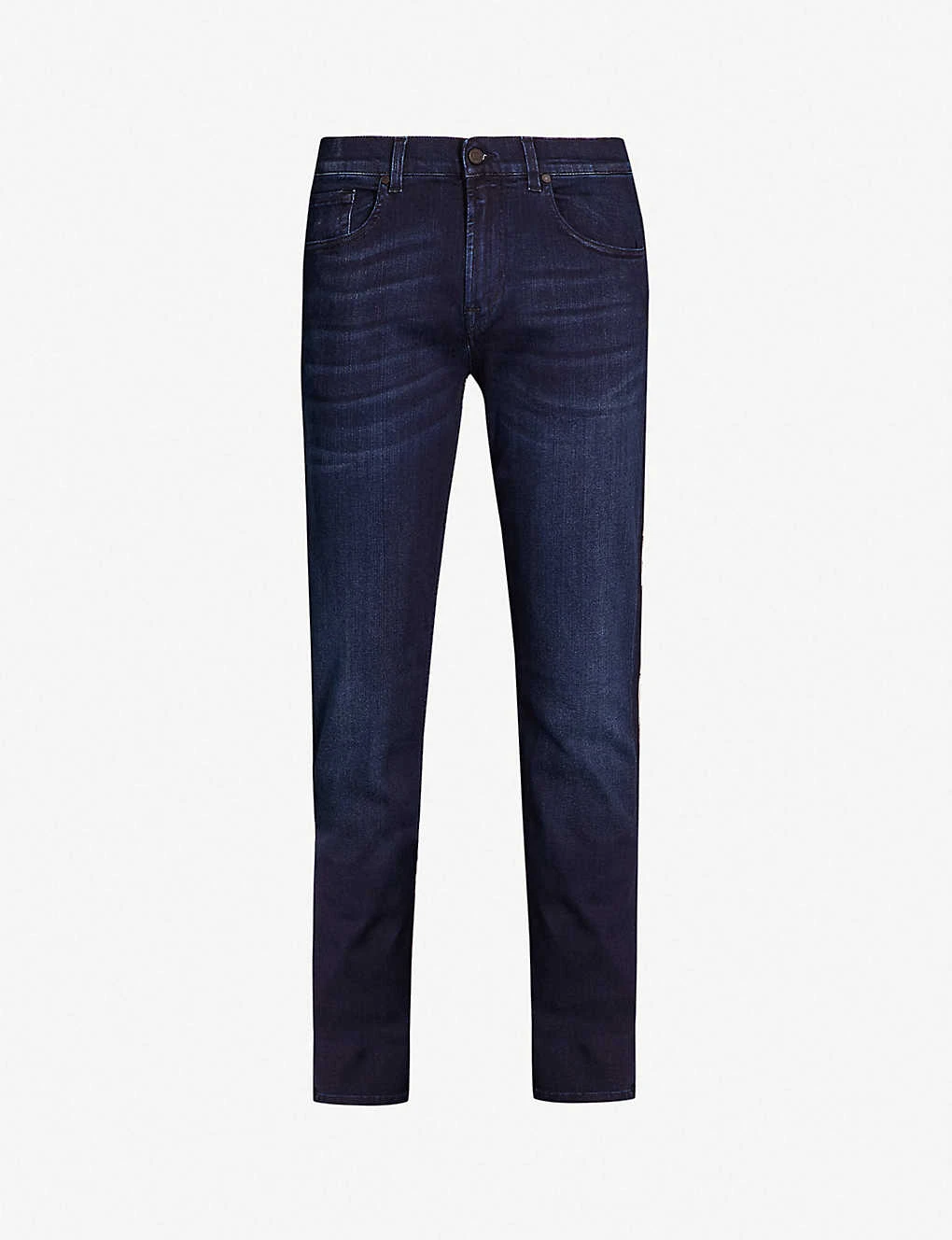 7 For All Mankind denim jeans Exposed button and concealed zip-fly fastening at front Slim-fit, tapered, mid-rise, belt loops, five pockets, branded hardware, faded wash and whiskering, brand label at back waistband and pocket, v-shaped yoke at back, stitch detailing at back pockets 56% cotton, 21% viscose, 14% modal, 7% polyester, 2% elastane Machine wash Size 32: Rise 10″”, inside leg 32″”, leg opening 14″” Model is 6ft and wears a size 32