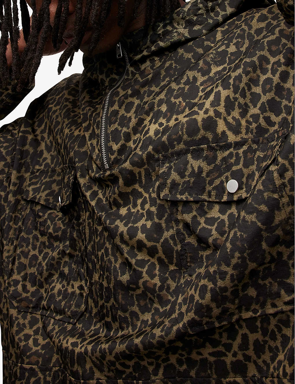 - Hooded zip opening, long sleeves, two studded patch pockets at front, drawstring hem, water resistant, all-over leopard print