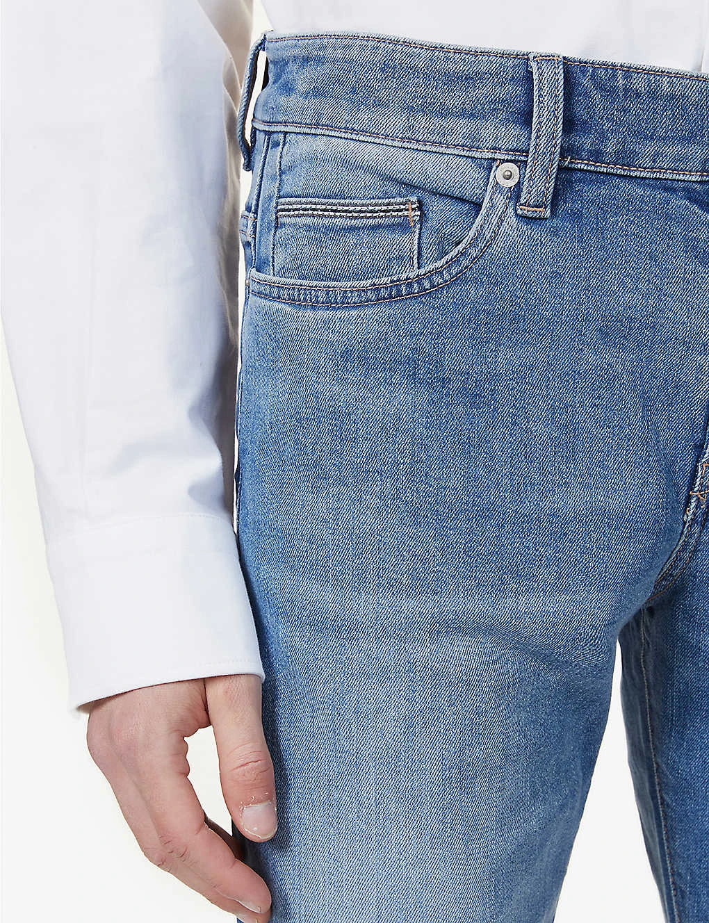- Regular fit, mid rise, slim leg, belt loops, five pockets, faded wash, brand patch at back waistband, V-shaped yoke at back