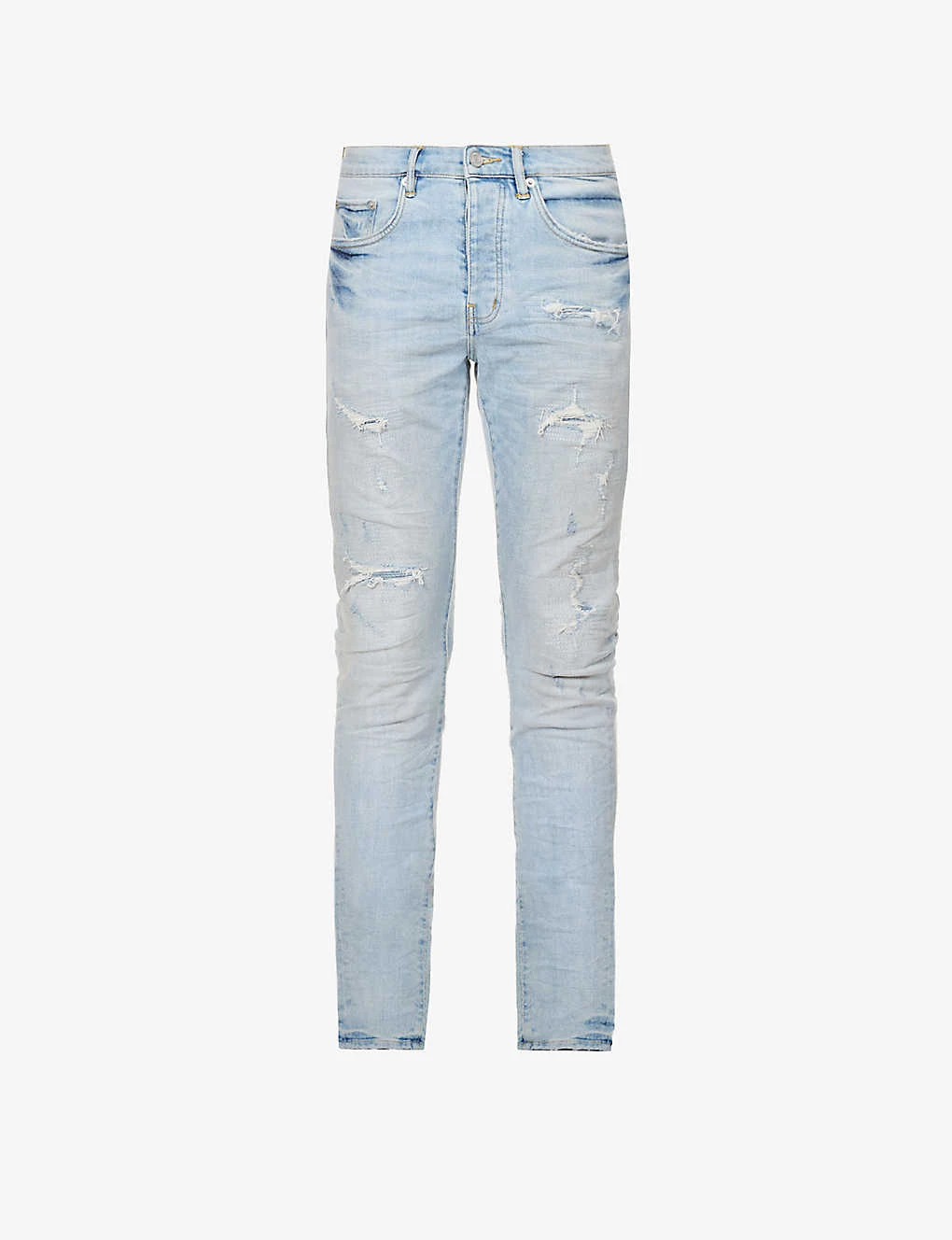 - Slim fit, high-rise, belt loops, five pockets, brand patch at back, contrast cu-out panels at back, faded wash, distressed, raw cuffs
