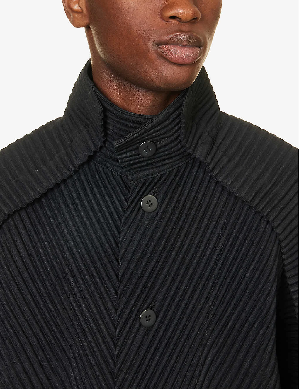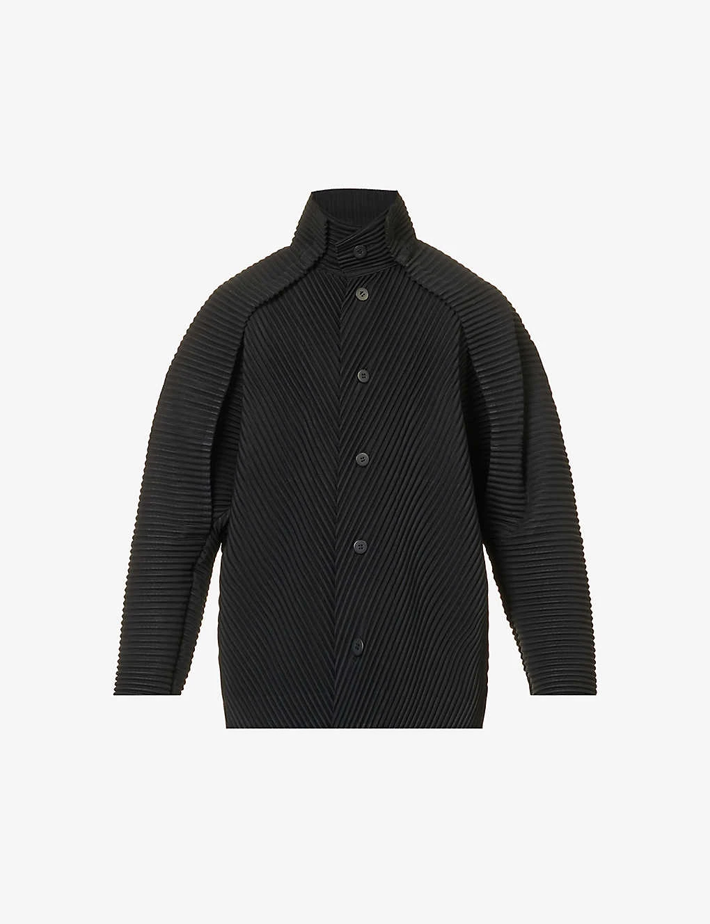 - Relaxed fit, stand collar, short sleeves, two slip pockets at front, all-over pleated design