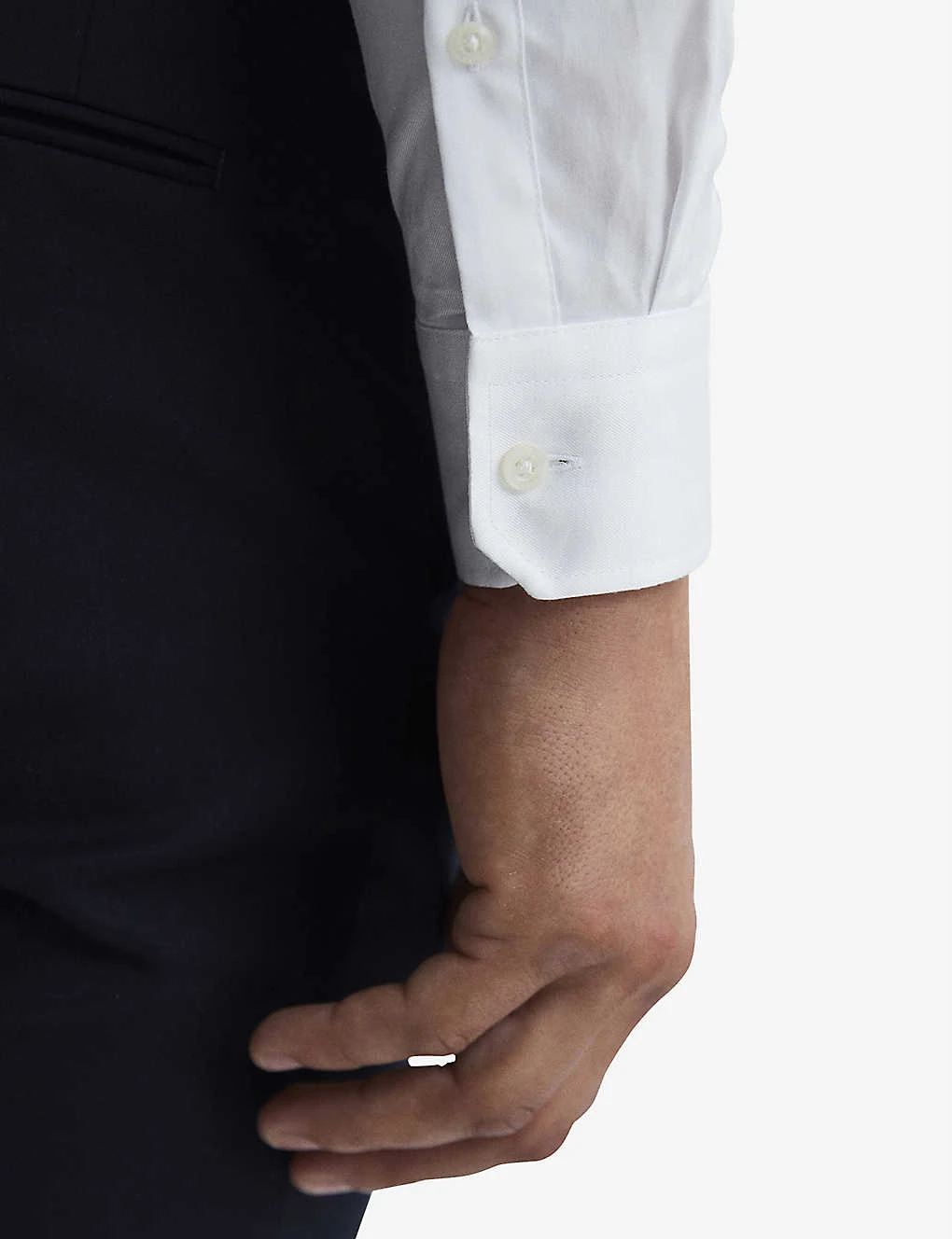 - Two-fold cotton, straight-point collar, chiselled buttoned cuffs, darting to the reverse