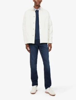 - Exposed button and concealed zip-fly fastening at front