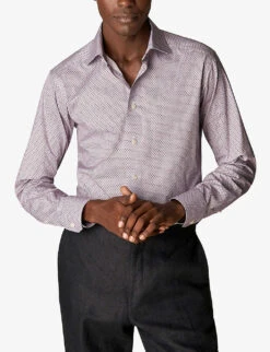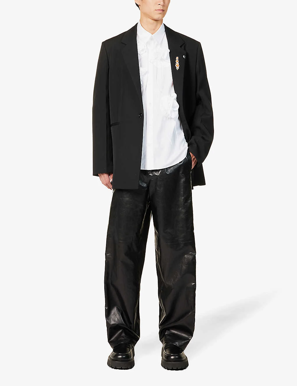 - Regular fit, long sleeves, pleated cuffs, all-over floral ruffle embellishments at front, box pleat at back, curved hem