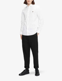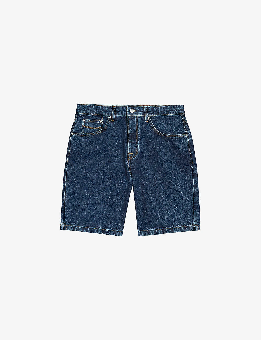 - Mid-rise, falls above the knee, contrasting topstitching, belt loops, silver-tone hardware, branded patch at back waistband, five pockets