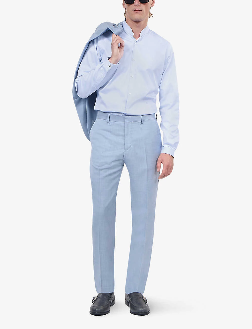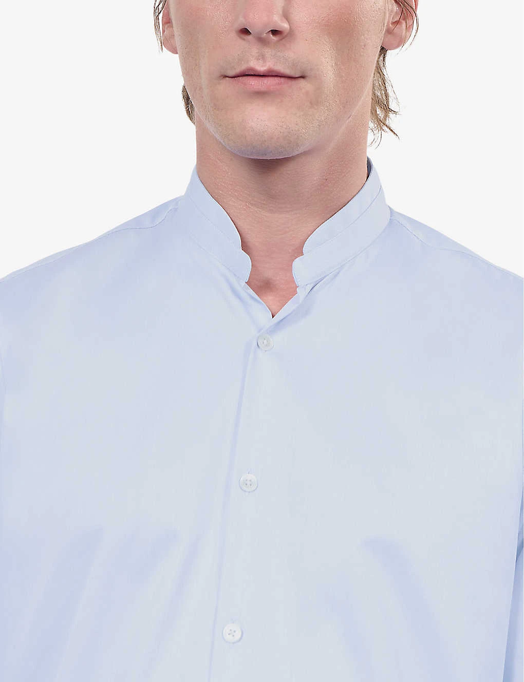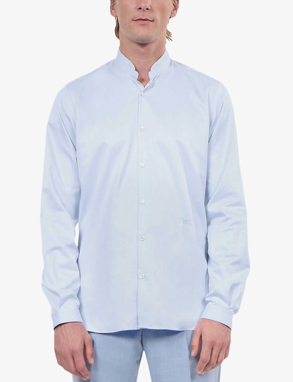- Slim-fit, mandarin collar, long sleeves, buttoned cuffs, curved hem