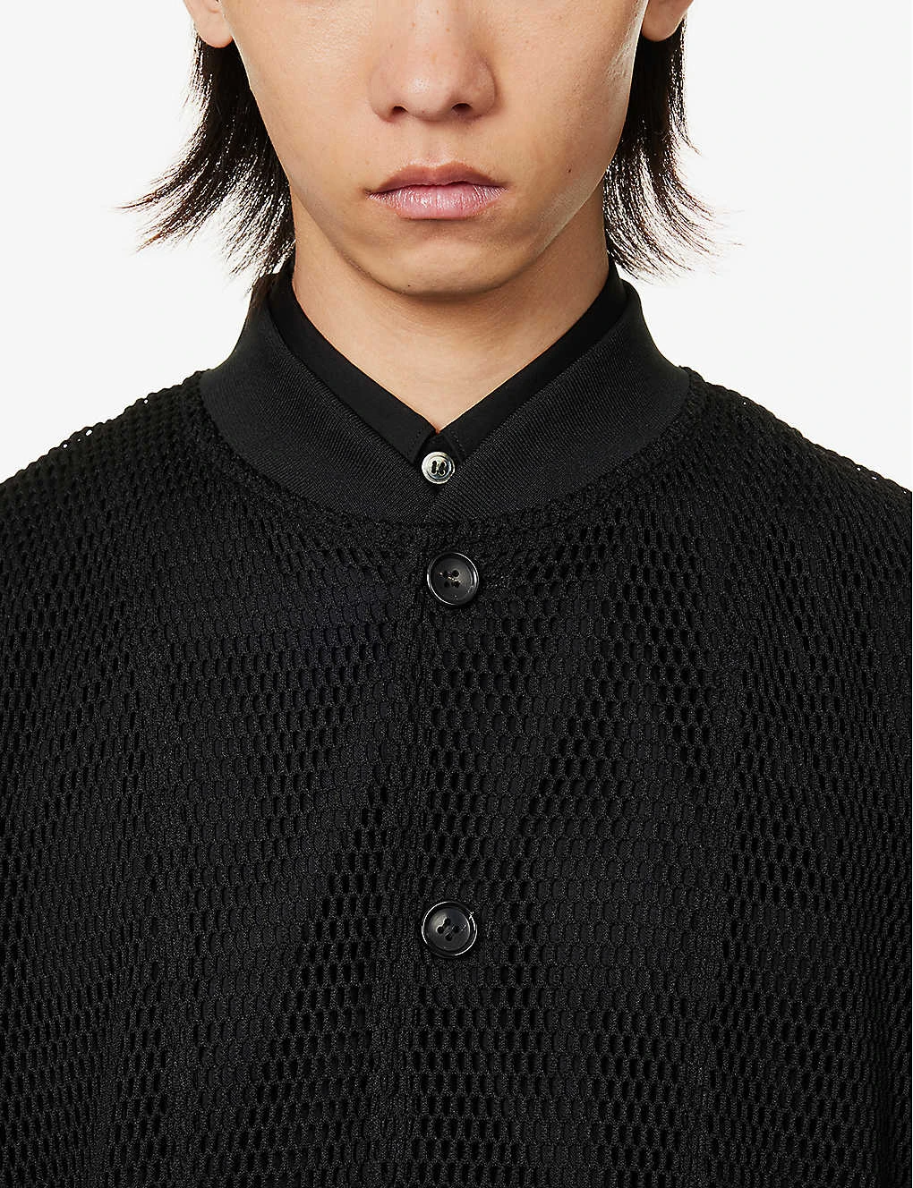 - Relaxed fit, ribbed crew neck, long sleeves, ribbed elasticated cuff, all over fishnet pattern, two internal patch pockets, asymmetric raw hem
